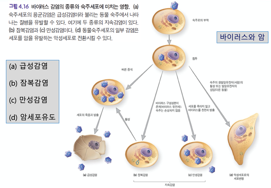 - 잠복감염 : 유전체는 존재하지만 세포가 죽지않음. 비리온을 방출시키지 않는다.