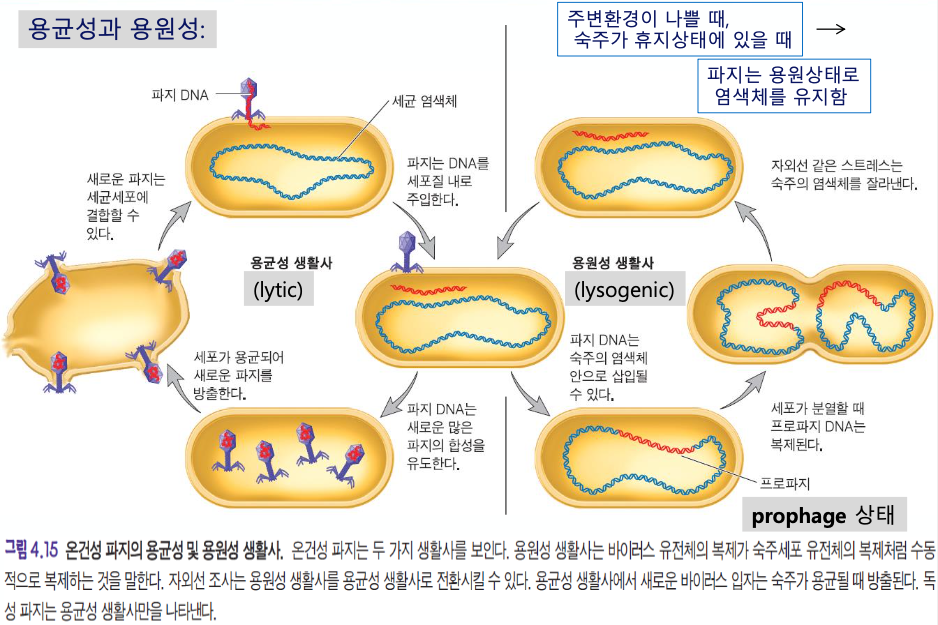 - Prophage : 파지의 DNA가 세균의 염색체 안으로 들어가버린 상태