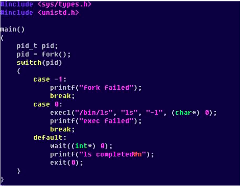 우리가 exec를 호출할 때 많은 경우에는 원래의 Process가 사라져 버리는 걸 원치 않을 것이다. 이럴 때 필요한 방법은 우리가 배웠다. 바로 fork()이다. 즉 자식 Process에서 새로운 Process를 로딩해서 일을 하게 하면 되는 것이다. 다음과 같은 소스가 바로 그런 예이다.