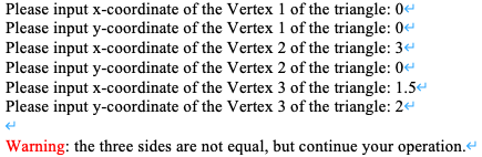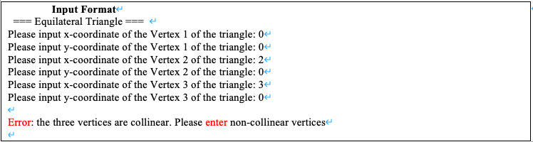 · If the tree vertices are collinear (lie on the same line), they cannot form a triangle because these points form a straight line. Check this by comparing their slopes. Hence, the program should display the error message and request the user to enter non-collinearvertices