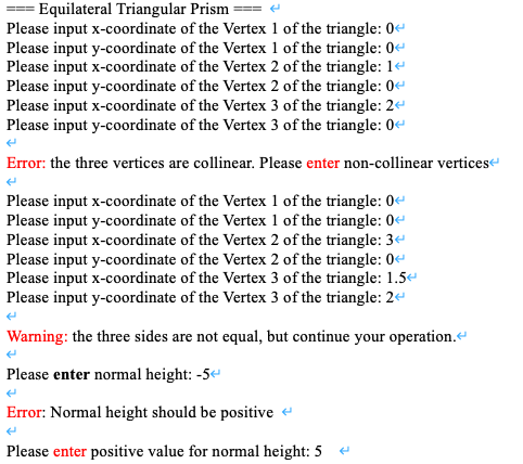 · If the height of the prism is zero or negative, the program should display the error message and request the user to enter valid height.