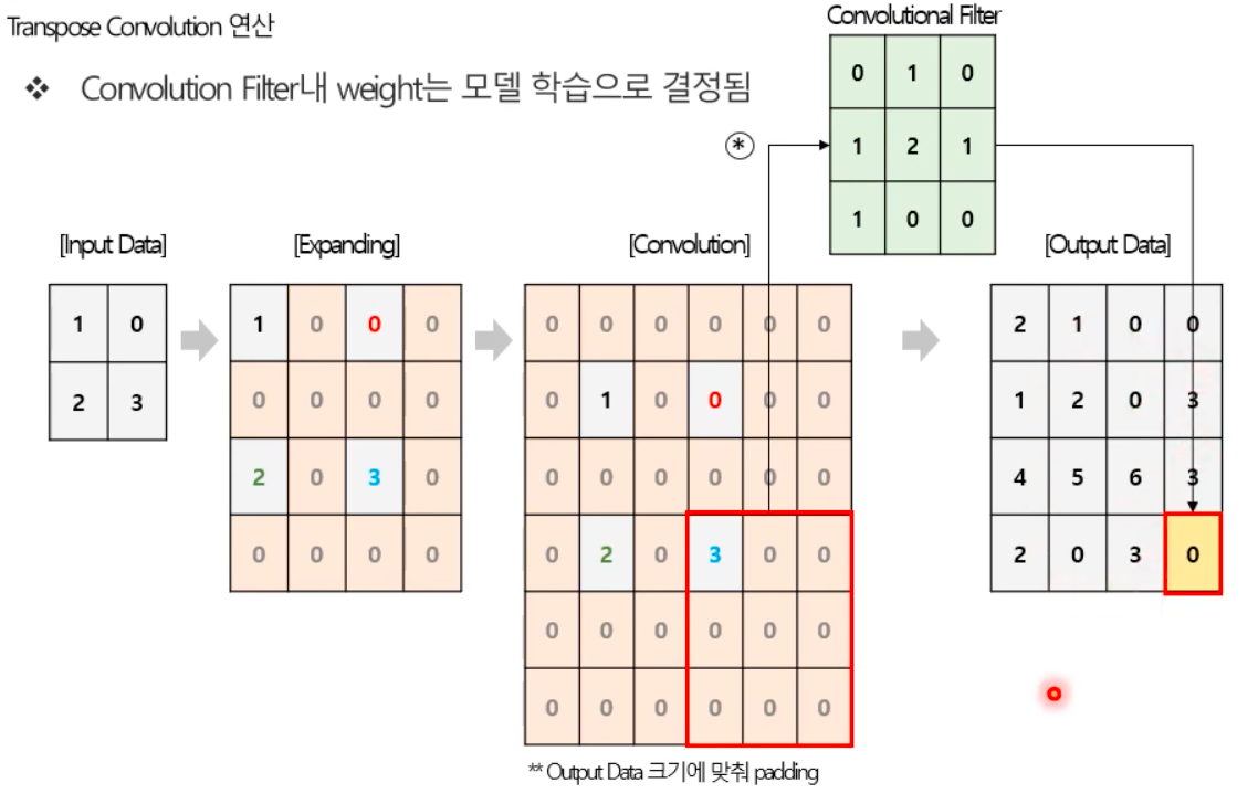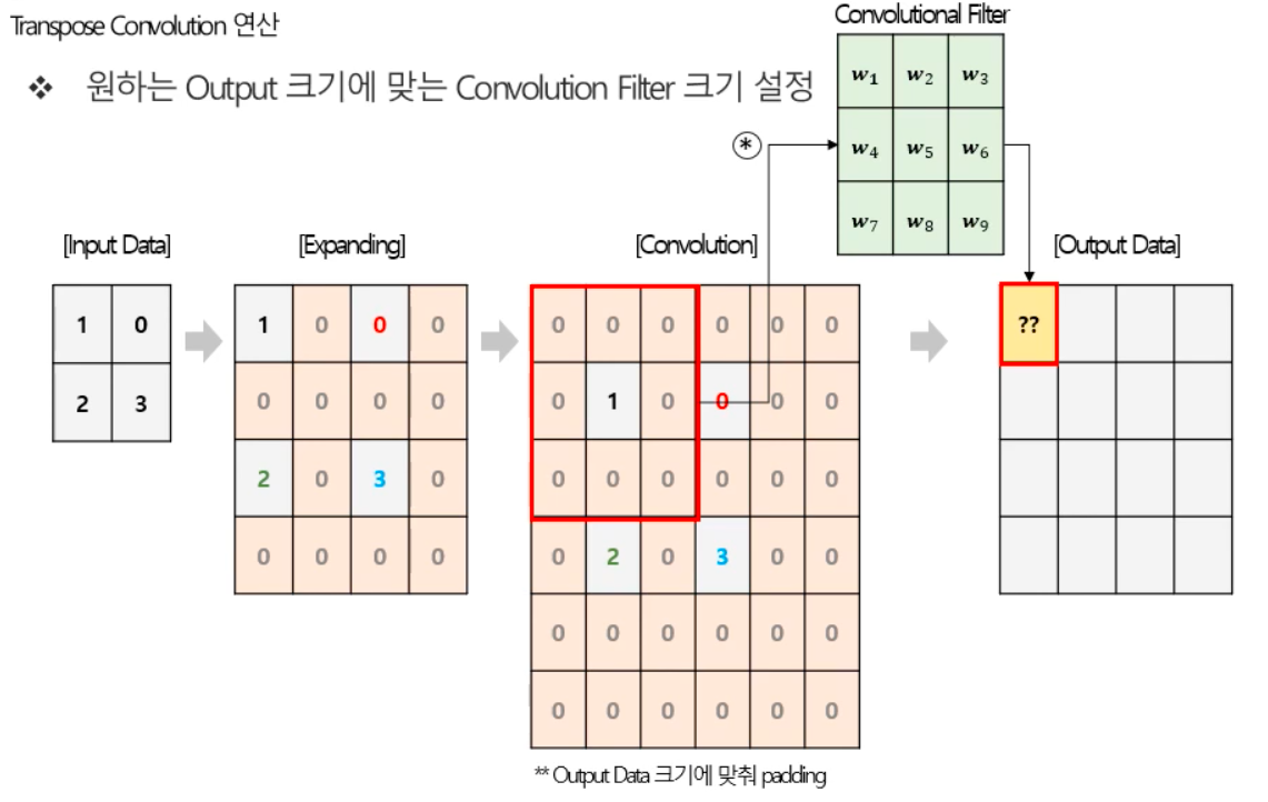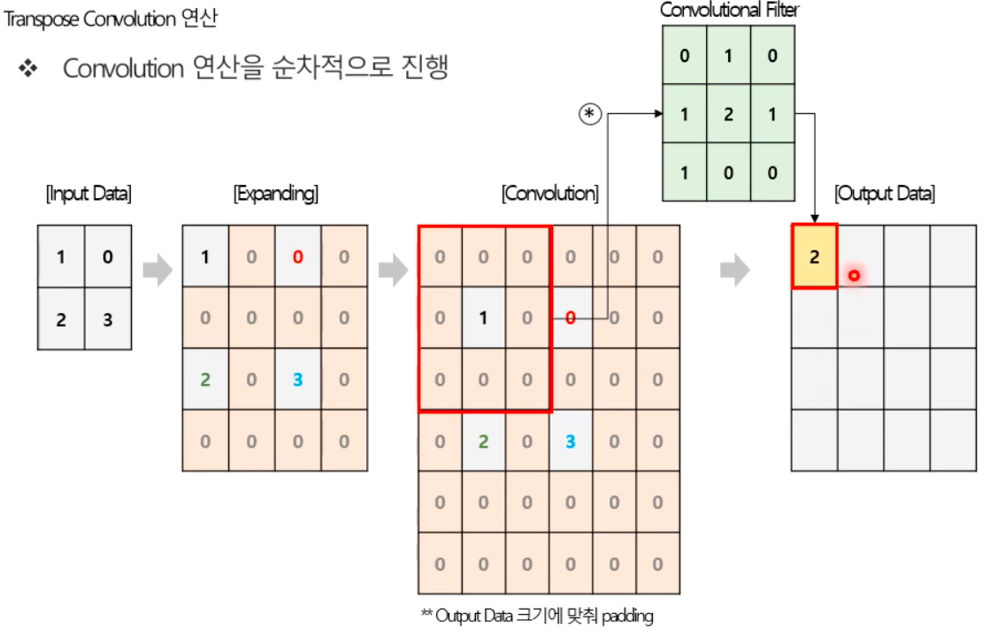(3) Transpose Convolution 연산 이후 원하는 Output Data 크기로 만들기 위해 필요한 크기만큼 zero padding을 진행한다.
