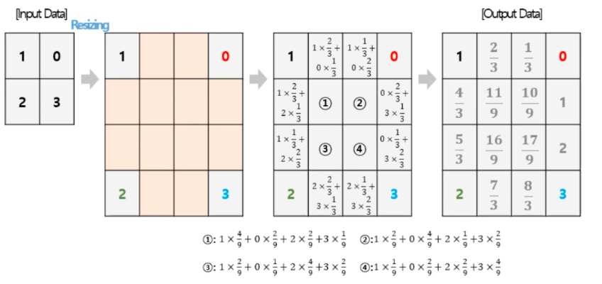 인접한 4개 픽셀에 대한 거리를 가중치로 두어 빈 영역을 채우는 방법이다.