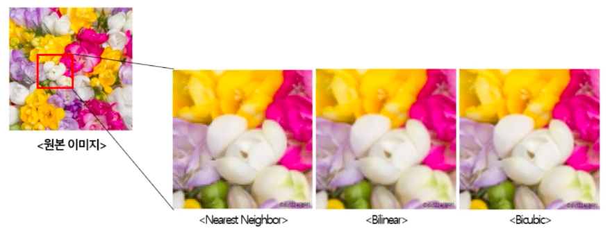 Bicubic interpolation 방법일 때 가장 선명하게 확대된 것을 확인할 수 있다.
