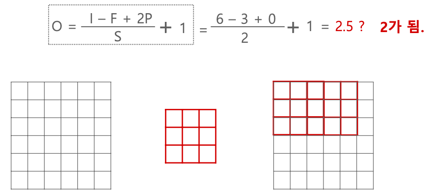 - O = (I - F + 2P)/2 + 1 = (6 - 3 + 0)/2 + 1 = 2.5 = 2