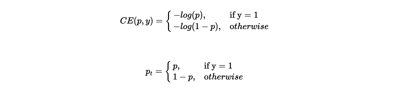 CE loss의 문제는 모든 sample에 대한 예측 결과를 동등하게 가중치를 둔다는 점이다. 이로 인해 어떠한 sample이 쉽게 분류될 수 있음에도 불구하고 작지 않은 loss를 유발하게 된다. 많은 수의 easy example의 loss가 더해지면 보기 드문 class를 압도해버려서 학습이 제대로 이뤄지지 않게 된다.