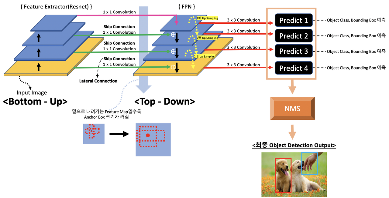 그리고 Top-Down 할 때의 각 Feature Map 마다 Object Detection을 수행해 예측한다. 이렇게 하면 여러가지의 예측된 Bounding Box가 생겨날 것이다. 마지막으로 Ground Truth와 IoU를 비교하면서 최적의 Bounding Box만을 남기기 위해 NMS(Non-Max Suppression)을 수행해주어 최종적인 Object Detection을 수행해준다.