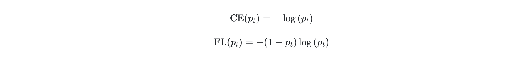 Focal Loss는 간단히 말하면 Cross Entropy의 클래스 불균형 문제를 다루기 위한 개선된 버전이라고 말할 수 있으며 어렵거나 쉽게 오분류되는 케이스에 대하여 더 큰 가중치를 주는 방법을 사용한다. (객체 일부분만 있거나, 실제 분류해야 되는 객체들이 이에 해당한다.) 반대로 쉬운 케이스의 경우 낮은 가중치를 반영한다. (background object가 이에 해당한다.)