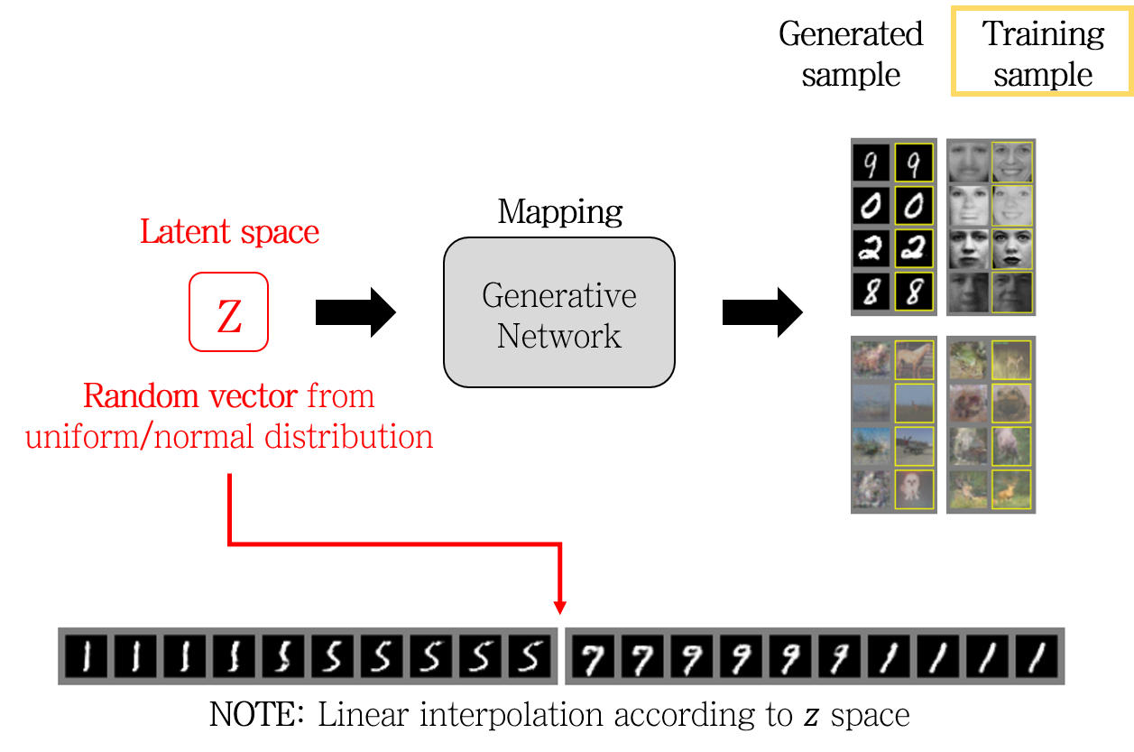 - Adversarial: G는 진짜와 가짜 이미지를 구별하는 Discriminative model 와 적대적으로 대립하며 각자 학습해나간다.