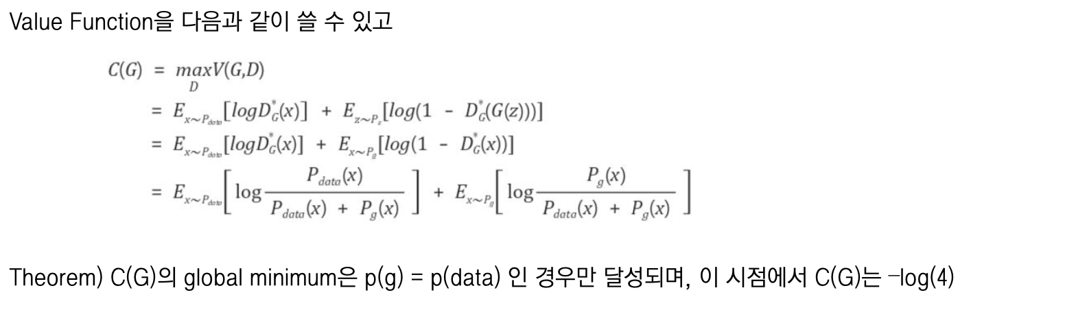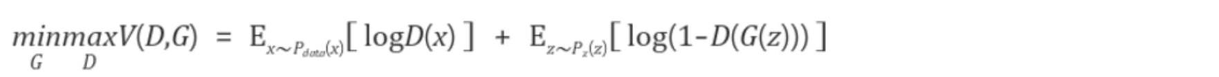 GAN은 D와 G에 대하여 다음과 같은 value function을 minmax problem으로 풀게 된다.