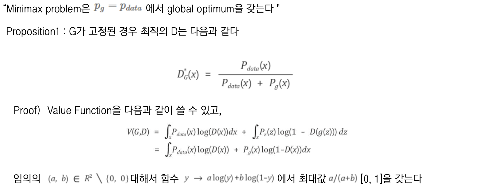 - D의 입장 : D(x)가 1이고 (진짜 데이터를 1로 구분) D(G(z))가 0일 때 (가짜 데이터를 0으로 구분) V는 최대값