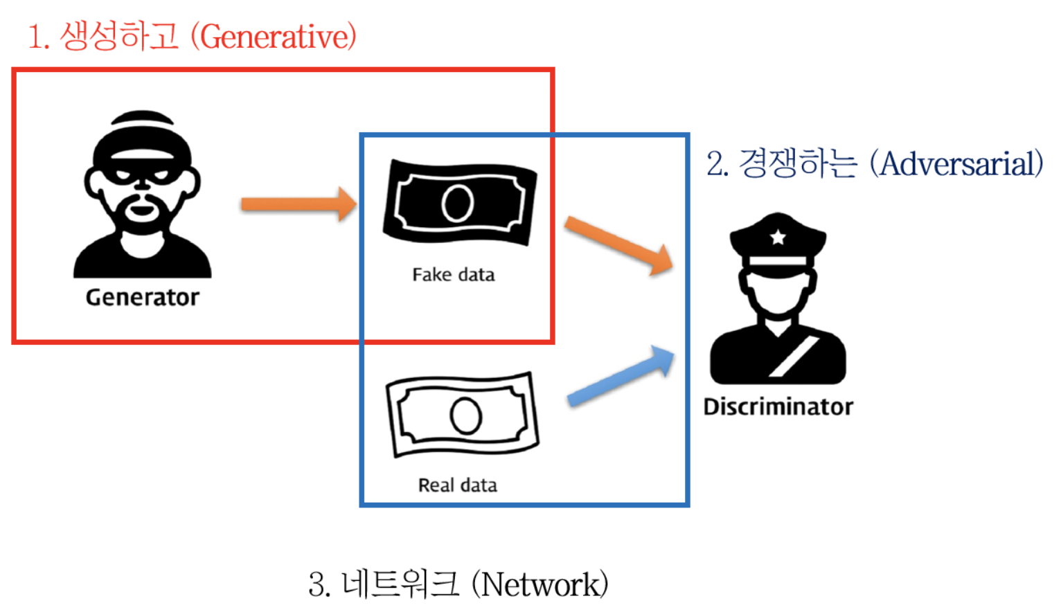 지폐위조범(Generator)은 경찰을 최대한 열심히 속이려고 하고 다른 한편에서는 경찰(Discriminator)이 이렇게 위조된 지폐를 진짜와 감별하려고(Classify) 노력한다. 어느 순간이 되면 지폐 위조범의 능력이 극에 달해 진짜와 다름없는 가짜 지폐를 만들게 됩니다. 이 때 경찰의 구별 확률은 로 수렴합니다. 이 상태에서 만들어진 가짜 지폐는 진짜 지폐처럼 보일 것이다.