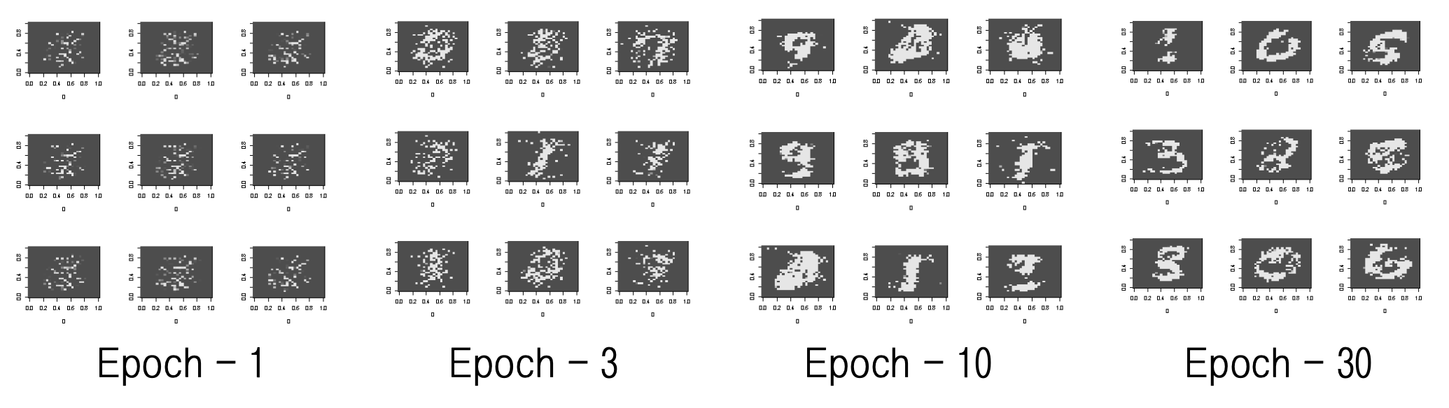 위 그림에서 (a)-(d) 각 그림은 시간의 순서를 나타냅니다. 각 그림의 하단부는 noise 로부터 진짜 이미지 x로 맵핑하는 것을 나타낸다. 그리고 상단부에서 검정색 점들의 분포는 실제 이미지의 분포를, 초록색 실선은 Generator가 만들어낸 가짜 이미지의 분포를 나타낸다. 시간이 흐름에 따라 (학습이 이루어짐에 따라) 점차 초록색 실선이 실제 분포에 fitting되는 것을 확인할 수 있다.