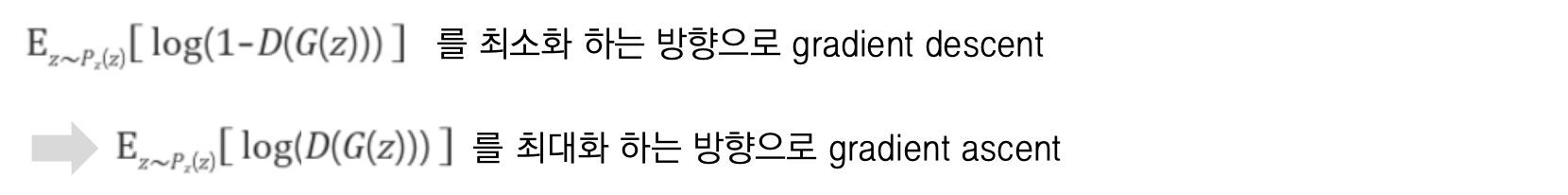 즉, D(G(z))가 1이 되게끔 학습시켜야 한다.
