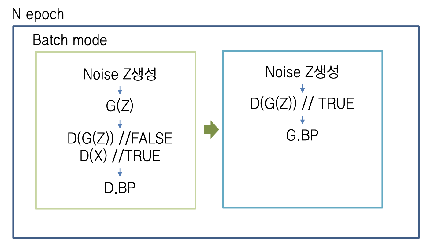 - 그 다음 노이즈를 생성하고 G(Z)가 1이 되게끔 Generator를 학습시킨다. 여기서 Discriminator는 건들이지 않는다.