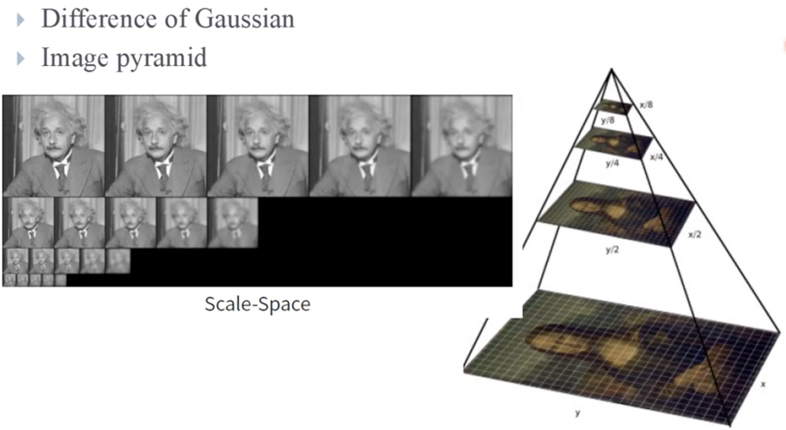 그래서 이를 해결하기 위해 Difference of Gaussian기법을 사용하는 Scale-Space 기법과 Image Pyramid 형태로 다양한 크기 관점에서 특징 검출을 해줌으로써 이전문제를 보완해주었습니다.