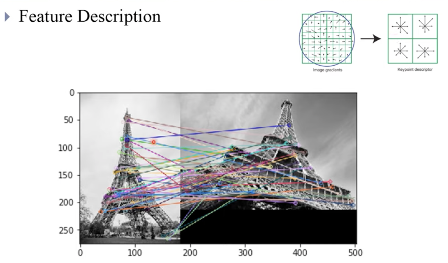 위 그림은 SIFT Feature Detection 기법을 사용하여 에펠탑의 특징들을 추출한 그림입니다. SIFT는 나온지 20년이 넘었음에도 여전히 많이 사용되고 있는 Feature Detection 기법입니다. 두 이미지 간의 추출한 feature들의 벡터 히스토그램을 생성하는 것이 Feature Description입니다.