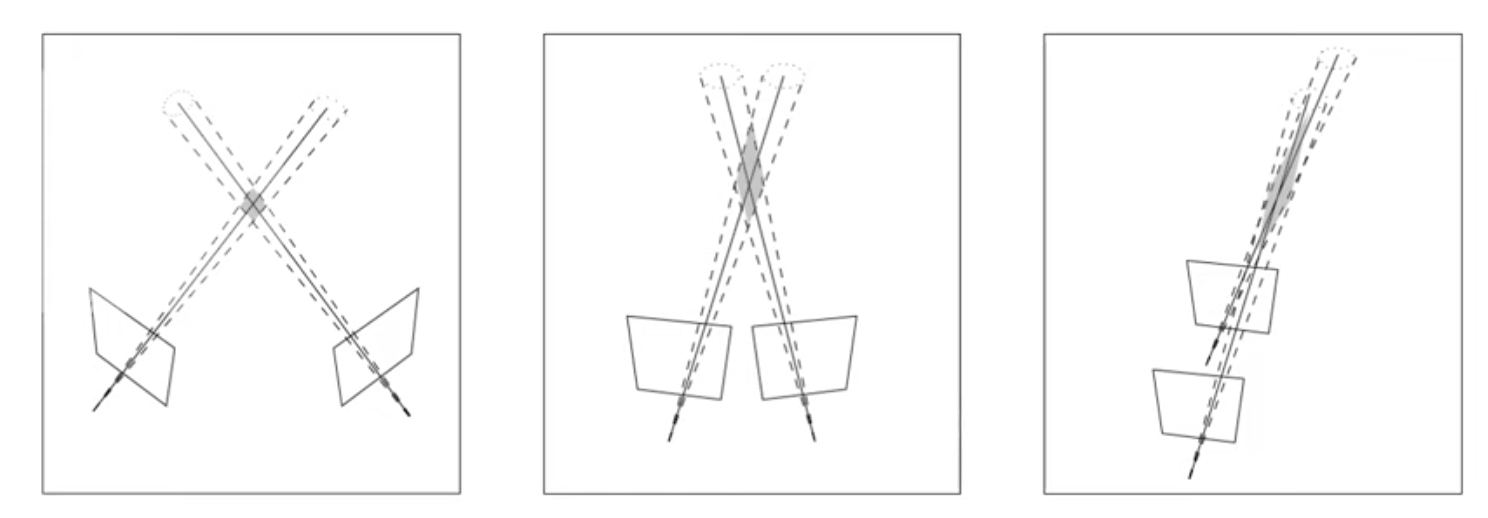 3D 좌표를 추정할 때 두 이미지간의 위치 관계가 어떻게 위치하느냐에 따라 Trade-off 관계가 있습니다. 가운데 보시면 마름모 위치가 3D point가 위치할 곳입니다. 각 이미지에서 관찰하는 좌표의 오차가 존재하기 때문에 크로스 되는 곳이 점이 아닌 마름모 형태를 띄게 됩니다.