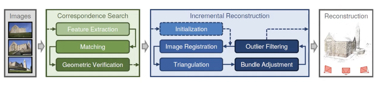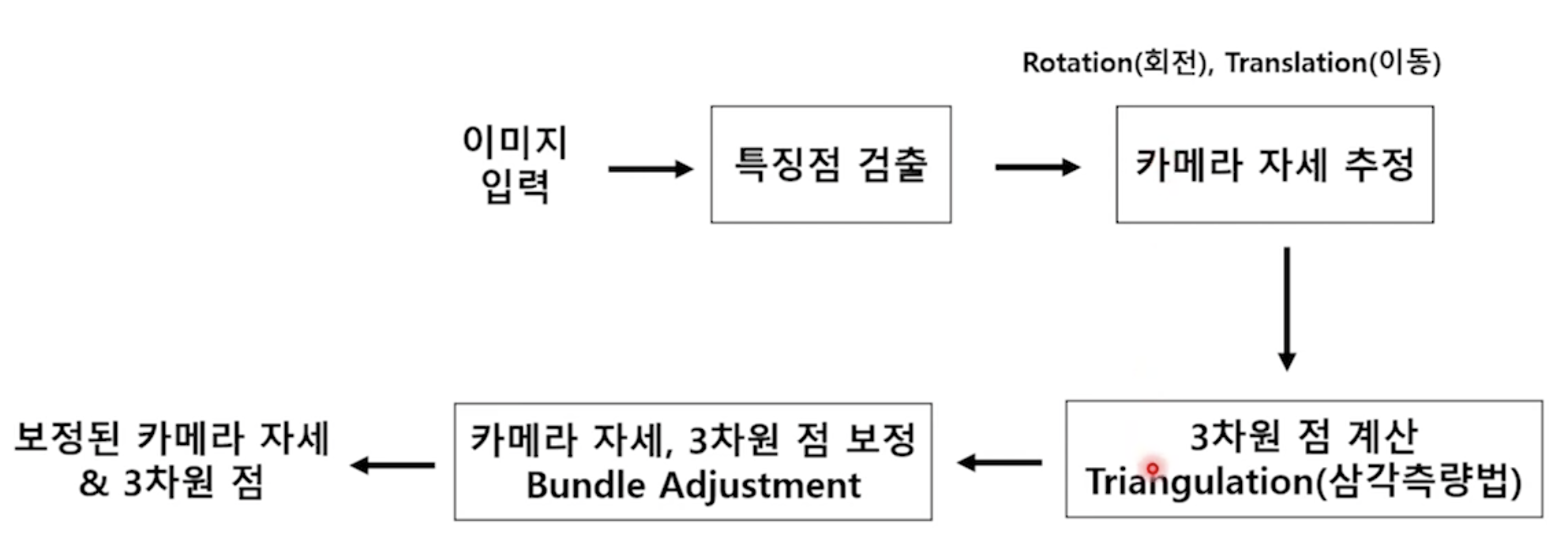 Structure from Motion은 순차적인 이미지 세트로부터 그림에서 보이는 바와 같이 Structure의 3D 재구성을 진행합니다.
