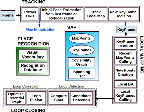 Tracking에서는 카메라 위치만을 고려한 Bundle Adjustment가 진행되고, Local Mapping에서는 3차원 지도의 전체가 아닌 일부만 활용해서 Bundle Adjustment가 수행되고, Loop Closing에서는 3차원 지도 전체를 활용한 Bundle Adjustment가 진행됩니다.