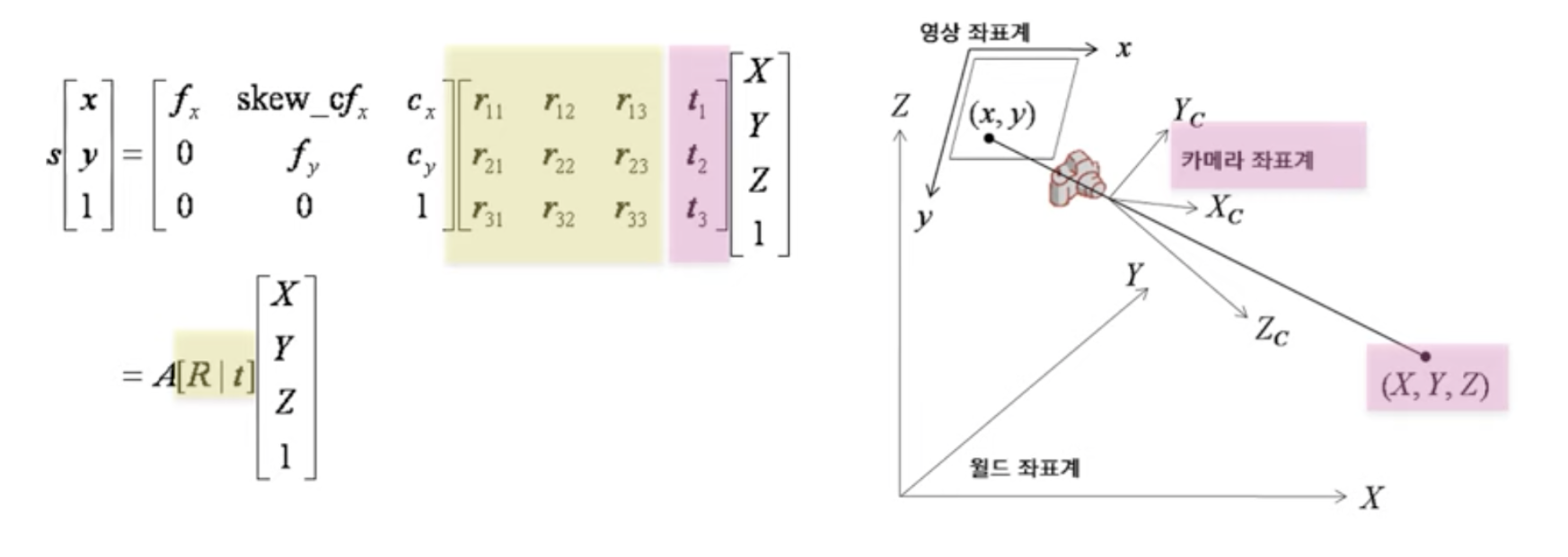 - [R|t] : 월드 좌표계를 카메라 좌표계로 변환시키기 위한 회전/이동변환 행렬(Extrinsic parameter)