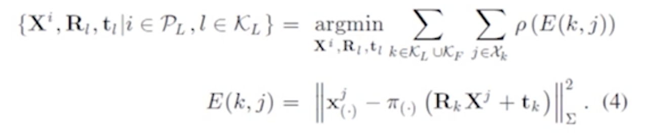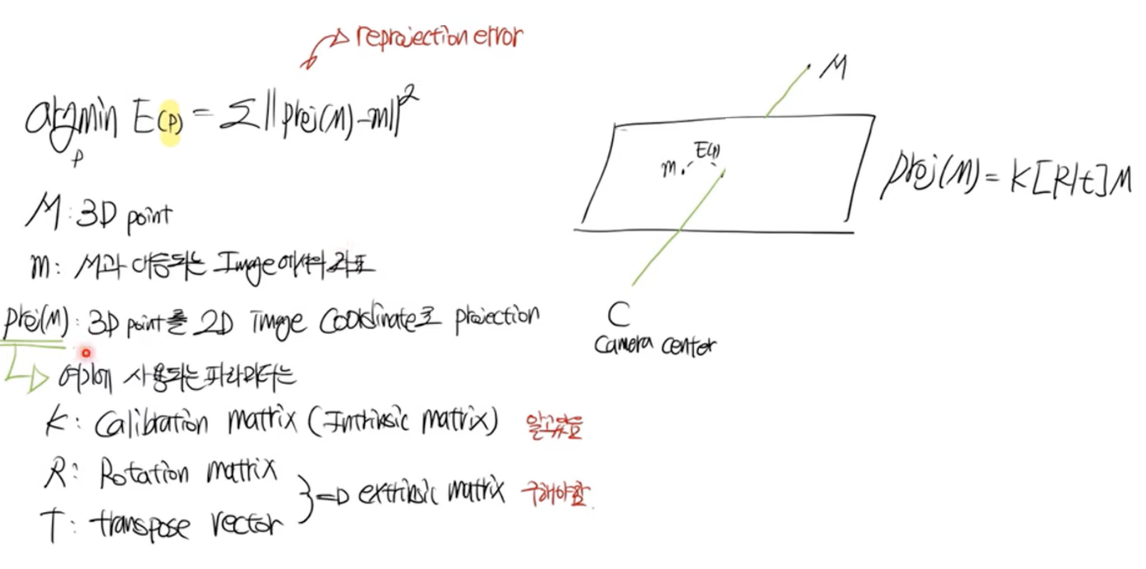 여기 Proj(M)에 사용되는 파라미터는 Calibration Matrix인 K가 있으며 Rotation Matrix와 translation Vector가 있습니다. 따라서 3D point가 2D 이미지로 Projection 된 좌표와 실제 3D point가 2D Image로 Projection된 좌표 사이를 줄이는 방식으로 에러를 줄이게 됩니다.