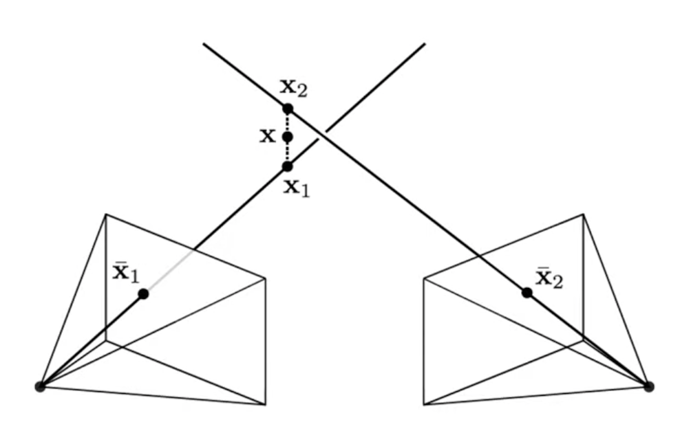 현재 보이시는 그림에서 x1과 x2는 각각 두 2D 이미지 상에서의 대응점을 나타냅니다. 만약 전혀 오차가 없는 상황이라면 x1에서 출발한 ray와 x2에서 출발한 ray가 3D 공간에서 정확히 한 점에 교차하게 됩니다. 하지만 실제로는 노이즈 등의 오차로 인해 두 ray가 정확히 만나지 않기 때문에, 두 ray 사이의 최단 거리 선분의 중점을 구하거나 최소자승법(least squares)을 사용하여 3D point를 추정하게 됩니다.