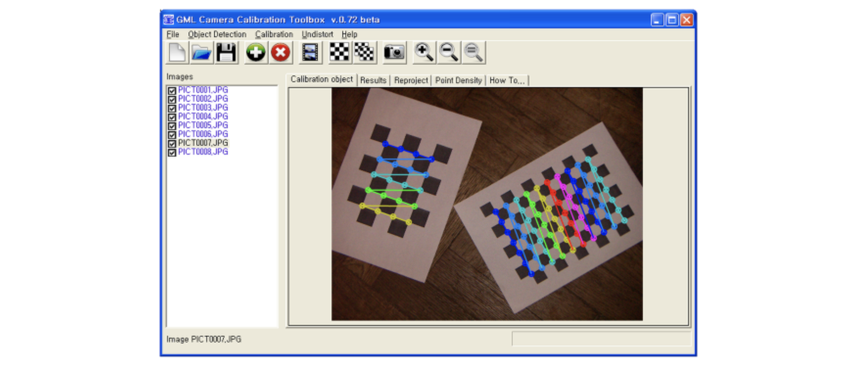 패턴의 왼쪽 위를 월드좌표계의 원점이라고 정의하면, 패턴의 실제 크기를 알고 있기 때문에 각각의 꼭지점의 위치를 알 수 있습니다. 그러면 우리가 추출한 피쳐들의 3차원 좌표들을 알고 있는 것이고 이 패턴을 실제로 촬영했기 때문에 영상상에서 피쳐들을 추출하게 되면 2차원 좌표도 알고 있는 것입니다. 즉, 3차원 점이 어떠한 위치로 맵핑이 되었는가를 2차원 영상좌표와의 매칭 쌍을 알수 있게 되는 것입니다.