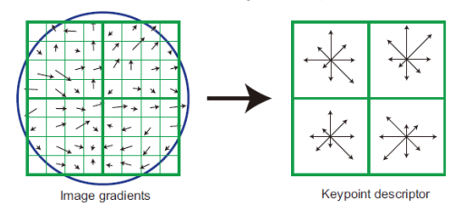 key point descriptor란, key point를 포함하는 16 x 16칸의 정보를 의미하는데, 실제 하나의 keypoint만으로는 매칭이 어렵기 때문이다. (확률적인 요소가 존재할 요소가 다분하다) 때문에 keypoint를 기준점으로 설정하고 16 x 16칸의 정보를 이용해서 매칭할 수 있도록 지문을 남겨두는 것이다.