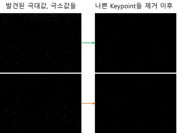 이렇게 얻은 극값이 모두 keypoint인 것은 아니다. 그렇기 때문에 일부 의미없는 keypoint를 제거해주어야 한다. 그 기준은 다음과 같다.