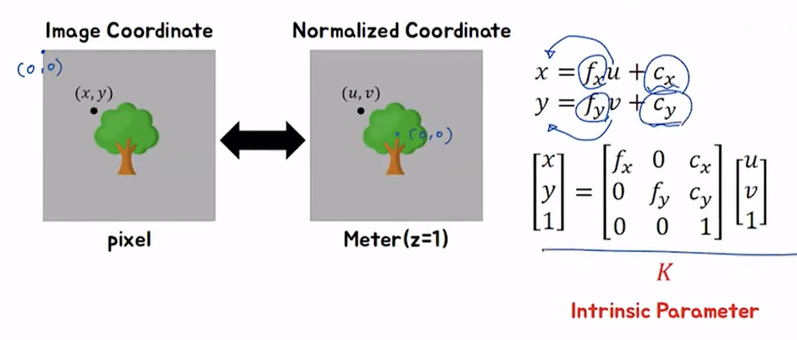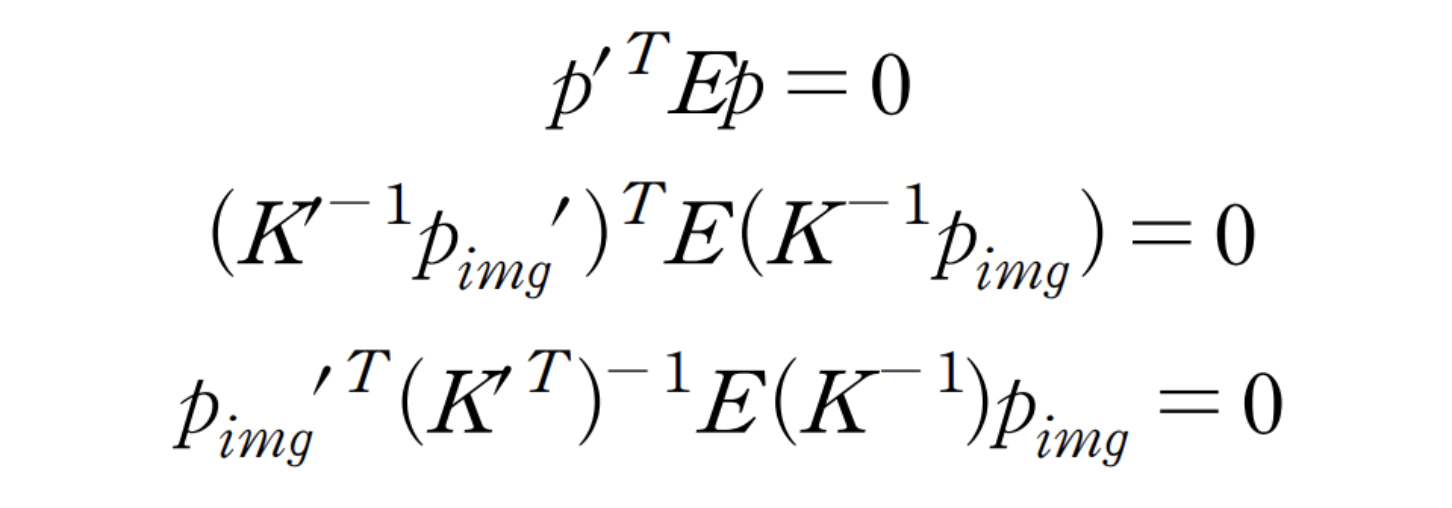 그렇기 때문에 Essential matrix를 구해야 합니다. Essential Matrix를 다시 정리하면, 정규화된 이미지 좌표에서의 매칭 쌍들 사이의 기하하적 관계를 설명하는 행렬입니다. 카메라 내부 파라미터 행렬인 K가 제거된 좌표계에서의 변환 관계입니다.