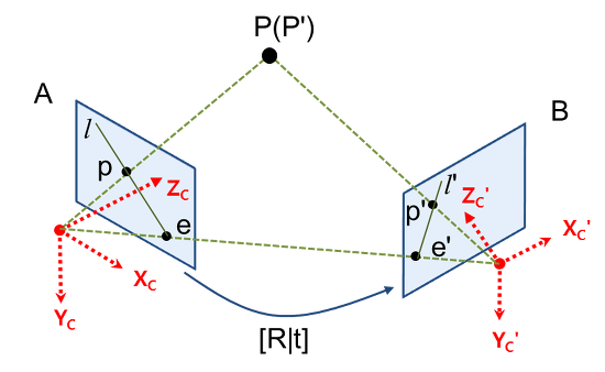 하지만 P는 카메라 A의 원점과 p를 잇는 직선(ray)상에 존재하기 때문에, 이 직선을 이미지 B에 투영시키면, 이 직선 위에 점 p'이 존재하는 것을 알 수 있다. 이 직선이 바로 epipolar line인 l' 이다.