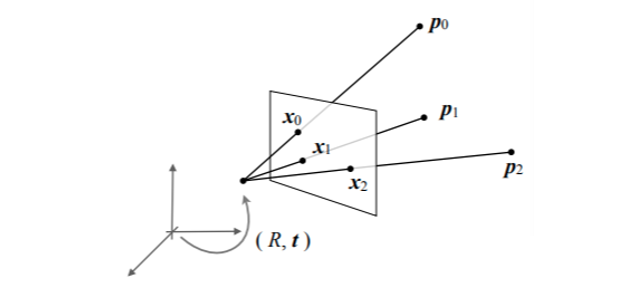 위의 그림처럼 3D point와 2D point가 주어졌을 때 카메라 R,t를 찾는 과정이고, 한개의 카메라에 대해서 3개의 좌표와 3개의 포인트가 주어졌을 때, 카메라의 pose를 구합니다. (R,t)