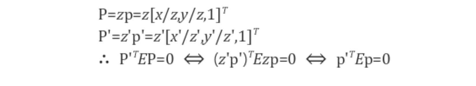 정리하면, p로부터 유일한 p'을 결정할 수는 없지만 epipolar line인 l'은 유일하게 결정할 수 있다. 그리고 이러한 epipolar line을 계산해주는 변환 행렬이 Fundamental Matrix, Essential Matrix 이다. 그리고 epipolar constraint 인 p' x E x p = 0을 만족시키는, E를 Essential Matrix라고 한다. (만약 보정된 이미지를 사용하고 초점 거리에 의해 나눠진 지점을 정규하시키면 F와 E는 동일하다.)