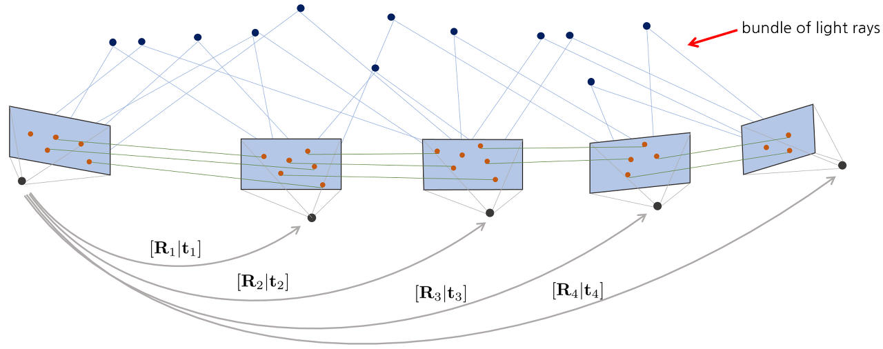 즉, 위 그림과 같이 연속적인 카메라 영상 + 매칭 쌍이 주어졌을 때 Camera pose 전체와 월드 좌표계의 점들 전체에 대한 최적의 위치를 찾는 방법입니다.